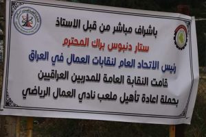 برعاية رئيس الاتحاد العام لنقابات العمال في العراق الاستاذ ستار دنبوس براك المحترم اقامت النقابة العامة للمدربين العراقيين مهرجان السلام بمناسبة تأهيل ملعب نادي العمال الرياضي وتوزيع التجهيزات الرياضية على أشبال النادي في ملعب نادي العمال الرياضي الكائن في بغداد الإسكان يوم السبت الموافق ٢٠٢٠/١/١٨