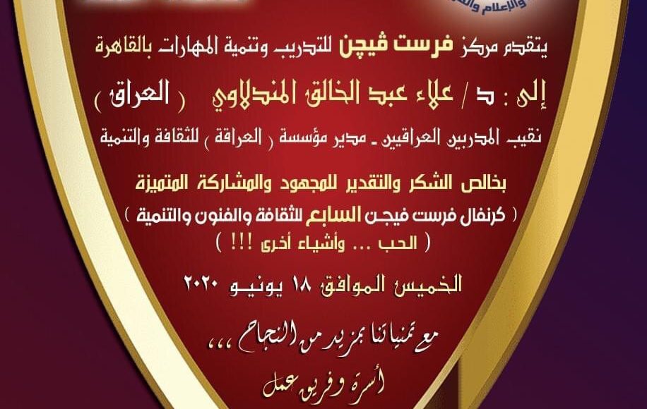 الشكر والإمتنان للحضور المميز والداعم الدائم لفعاليات واحتفالات مركز ” فرست فيجن ” القاهرة ——————— إلـى : د / علاء عبد الخالق المندلاوي نقيب المدربين العراقيين – مدير مؤسسة ” العراقة ” بغداد .. ضمن المشاركة بالكرنفال السابع للثقافة والفنون والتنمية .. ” الحب وأشياء أخرى ” – الخميس 18 يونيو 2020