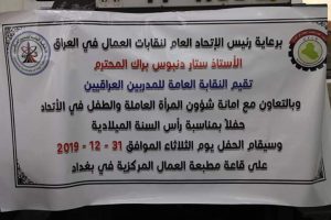 برعاية الاستاذ ستار دنبوس براك رئيس الاتحاد العام لنقابات العمال في العراق- نائب الامين العام للاتحاد الدولي لنقابات العمال العرب اقامت النقابة العامة للمدربين العراقيين بالتعاون مع أمانة شؤون المرأة العاملة العراقية والطفل احتفالية مصغرة في مقر مطبعة العمال المركزية صباح اليوم الثلاثاء الموافق 2019/12/31 بمناسبة رأس السنة الميلادية الجديدة وتم توزيع الهدايا على العاملين في مقر المطبعة العمال المركزية وتمنى رئيس الاتحاد العام ونائبه الاستاذ الغانمي والسادة اعضاء المكتب التنفيذي ان يكون عاماً سعيدا على جميع.مقدمين شكرهم وتقديريهم العاليين الى الدكتور علاءعبد الخالق المندلاوي رئيس النقابة العامة للمدربين العراقيين على مبادراته الرائعة التي تبعث الفرح والسرور في قلوب العاملين .
