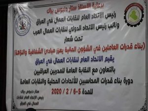 تحت شعار (بناء قدرات العاملين في الشؤون المالية يعزز مبادئ الشفافية والنزاهة) وبرعاية الاستاذ ستار دنبوس براك رئيس الاتحاد العام لنقابات العمال في العراق اختتام دورة الادارة المالية والرقابية التي أقامتها امانة الشؤون المالية في الاتحاد العام لنقابات العمال في العراق بالتنسيق مع النقابة العامة للمدربين العراقيين للعاملين في المجالات المالية والحسابية والرقابية .