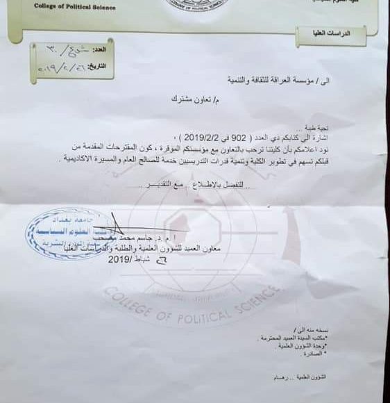 الاعتمادات وكتب الشكر تعاون مشترك مع كلية العلوم السياسية / جامعة بغداد تعاون مشترك مع كلية العلوم السياسية / جامعة بغداد في الانشطة والبرامج التي تقدمها مؤسسة العراقة للثقافة والتنمية بواسطة هيئة التحرير في يونيو 6, 2019 199 شارك 199 شارك فيسبوكTwitterجوجل بلسReddItواتس ابباينتريستالبريد الإلكتروني