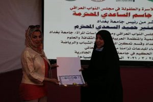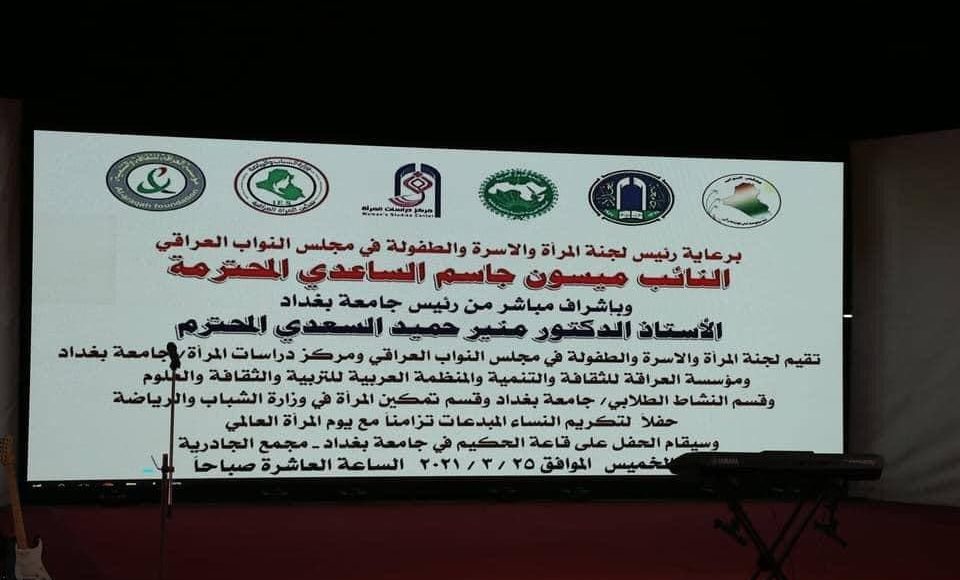 اقامت لجنة المرأة والاسرة والطفولة في مجلس النواب العراقي ومركز دراسات المرأة/ جامعة بغداد ومؤسسة العراقة للثقافة والتنمية والمنظمة العربية للتربية والثقافة والعلوم وقسم النشاط الطلابي/ جامعة بغداد وقسم تمكين المرأة في وزارة الشباب والرياضة حفلاً لتكريم النساء المبدعات تزامناً مع يوم المرأة العالمي يوم الخميس الموافق ٢٥ / ٣ / ٢٠٢١