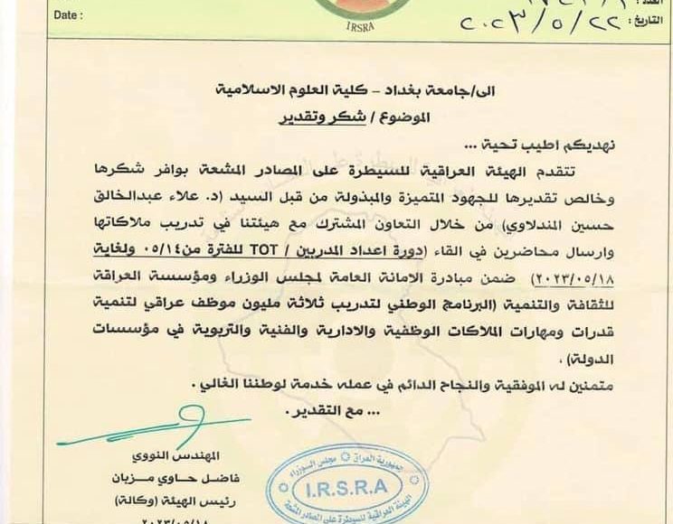 شكر وتقدير من مجلس الوزراء/ الهيئة العراقية للسيطرة على المصادر المشعة للملاك لمؤسسة العراقة للثقافة والتنمية والملاك التدريبي لجهودهم العلمية في دورة اعداد المدربين لموظفي الهيئة.