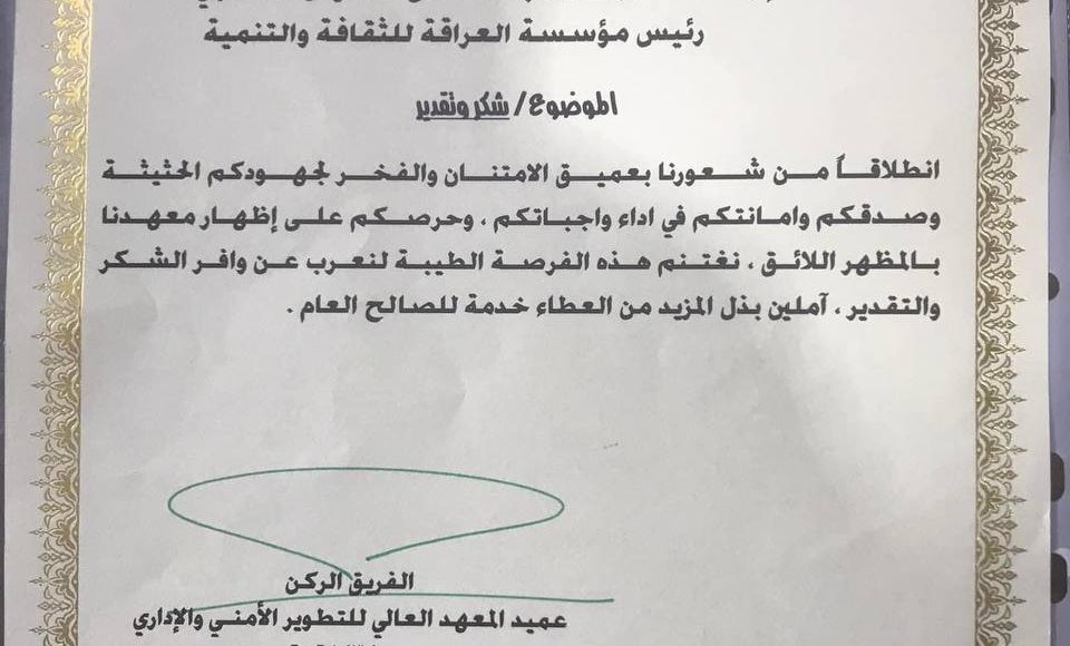 الاعتمادات وكتب الشكر شكر وتقدير من وزارة الداخلية لرئيس مؤسسة العراقة للثقافة والتنمية بواسطة هيئة التحرير في أبريل 11, 2024 493 شارك وزارة الداخلية تقدم الشكر والتقدير لرئيس مؤسسة العراقة للثقافة والتنمية الدكتور علاء عبدالخالق المندلاوي لجهودة التدريبية لتطوير ملاكات ومنتسبي الوزارة . 493 شارك فيسبوكTwitterجوجل بلسReddItواتس ابباينتريستالبريد الإلكتروني