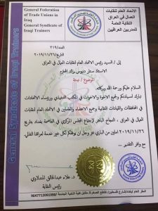 قدمت النقابة العامة للمدربين العراقيين في الاتحاد العام لنقابات العمال في العراق برقية تهنئة الى جميع الكوادر النقابية والعمالية في بغداد والمحافظات وعلى رأسهم الاستاذ ستار دنبوس براك رئيس الاتحاد العام لنقابات العمال في العراق-نائب الامين العام للاتحاد الدولي لنقابات العمال العرب مباركة النجاح الكبير لاجتماع المجلس المركزي ومتمنيةً للجميع الموفقية والنجاح الدائم في اداء عملهم النقابي خدمة لعراقنا الغالي