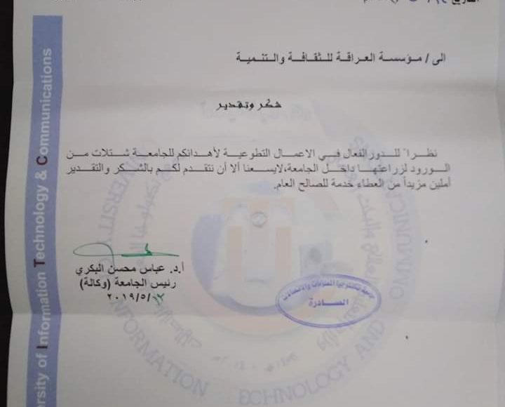 الاعتمادات وكتب الشكر كتاب شكر من جامعة تكنولوجيا المعلومات والاتصالات كتاب شكر من جامعة تكنولوجيا المعلومات والاتصالات بواسطة هيئة التحرير في يوليو 18, 2019 358 شارك 358 شارك فيسبوكTwitterجوجل بلسReddItواتس ابباينتريستالبريد الإلكتروني