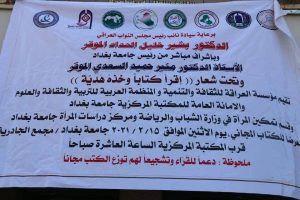وتحت شعار (اقرأ كتابا وخذه هدية) قامت مؤسسة العراقة للثقافة والتنمية و المنظمة العربية للتربية والثقافة والعلوم والامانة العامة للمكتبة المركزية جامعة بغداد وقسم تمكين المرأة في وزارة الشباب والرياضة ومركز دراسات المرأة جامعة بغداد ، معرضاً للكتاب المجاني ، الاثنين الموافق١٥/٢/٢٠٢١ جامعة بغداد / مجمع الجادرية
