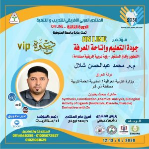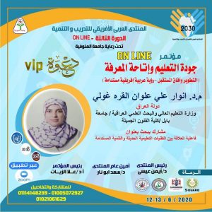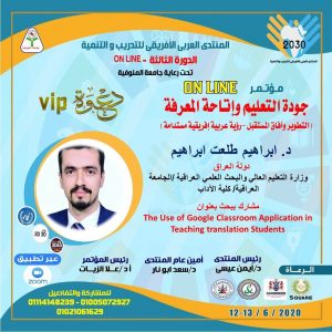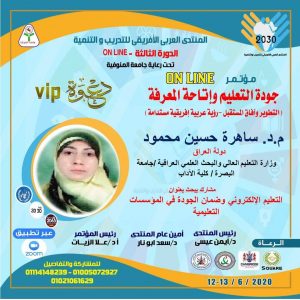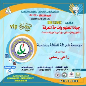 وقائع المؤتمر العلمي الدولي في جمهورية مصر العربية بعنوان :(جودة التعليم واتاحة المعرفة) اقامت جامعة المنوفية كلية الاداب (جامعة حكومية/ مصر ) بالتعاون مع المنتدى العربي الافريقي للتدريب والتنمية والنقابة العامة للمدربين العراقيين ومؤسسة العراقة للثقافة والتنمية المؤتمر العلمي الدولي في جمهورية مصر العربية بعنوان(جودة التعليم واتاحة المعرفة) إلكترونياً عن بعد عن طريق برنامج زووم Zoom للمدة من ١٢-١٣ /٦/ ٢٠٢٠ بمشاركة عراقية فاعلة.
