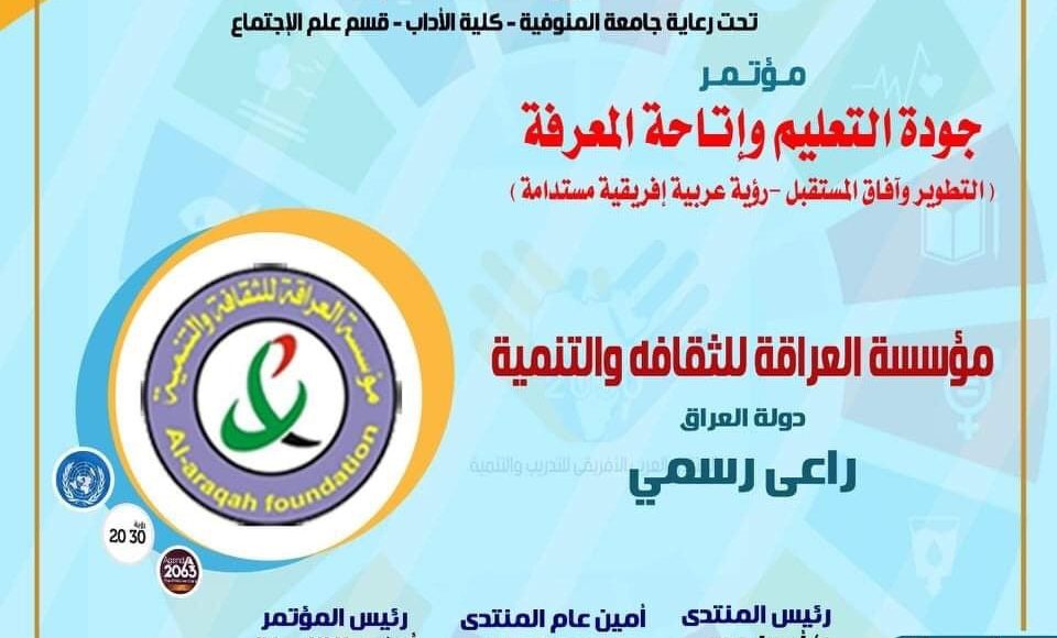 المؤتمر العلمي الدولي في جمهورية مصر العربية بعنوان :(جودة التعليم واتاحة المعرفة) جامعة المنوفية كلية الاداب (جامعة حكومية) بالتعاون مع المنتدى العربي الافريقي للتدريب والتنمية والنقابة العامة للمدربين العراقيين ومؤسسة العراقة للثقافة والتنمية للمدة من ٢٨_٢٩ /٢٠٢٠/٣