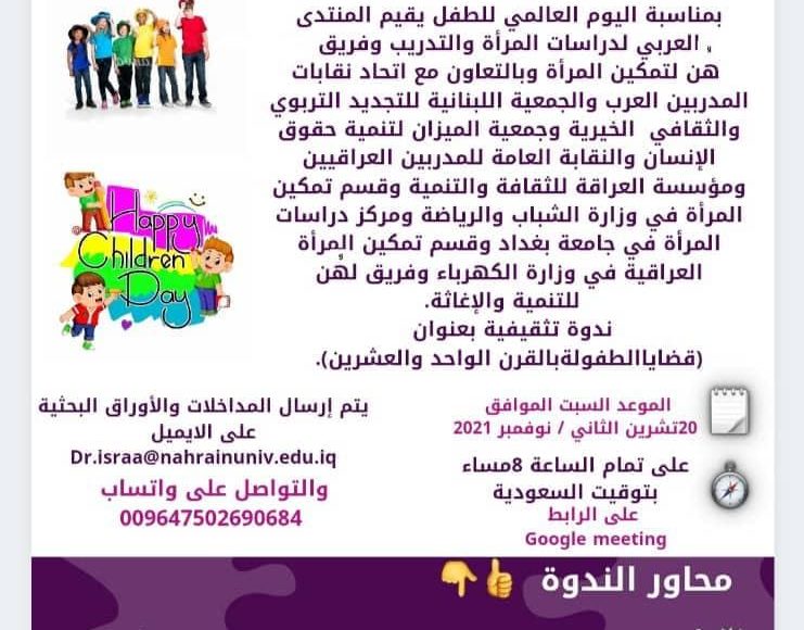 الدورات والندوات العلمية بمناسبة يوم العالمي للطفل دوة تثقيفية بعنوان ( قضايا طفولة في القرن الواحد والعشرين ) بواسطة هيئة التحرير في نوفمبر 5, 2021 161 شارك بمناسبة يوم العالمي للطفل دوة تثقيفية بعنوان ( قضايا طفولة في القرن الواحد والعشرين ) بمشاركة مؤسسات عربية وعراقية فاعلة . 161 شارك فيسبوكTwitterجوجل بلسReddItواتس ابباينتريستالبريد الإلكتروني