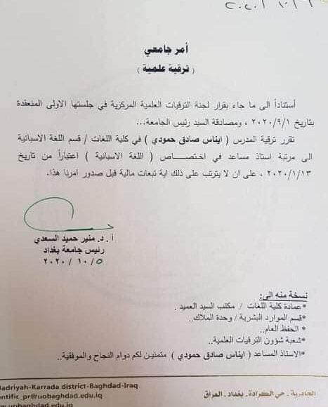 اخبار المؤسسة ترقية علمية لعضو مؤسسة العراقة للثقافة والتنمية السيدة ايناس صادق حمودي بواسطة هيئة التحرير في أكتوبر 8, 2020 499 شارك ترقية علمية لعضو مؤسسة العراقة للثقافة والتنمية السيدة ايناس صادق حمودي التدريسية في جامعة بغداد كلية اللغات إلى مرتبة استاذ مساعد 499 شارك فيسبوكTwitterجوجل بلسReddItواتس ابباينتريستالبريد الإلكتروني