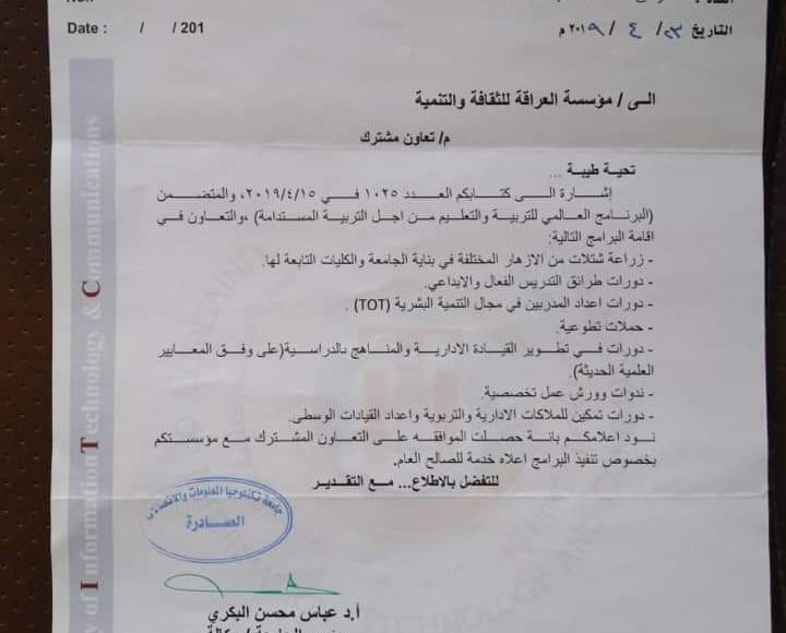 الاعتمادات وكتب الشكر تعاون مشترك كتاب تعاون مشترك بين جامعة تكنولوجيا المعلومات والاتصالات ومؤسسة العراقة للثقافة والتنمية بواسطة هيئة التحرير في أغسطس 13, 2019 157 شارك 157 شارك فيسبوكTwitterجوجل بلسReddItواتس ابباينتريستالبريد الإلكتروني