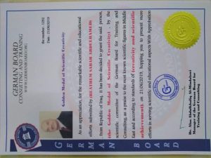 على هامش المؤتمر الدولي الاربعون :(شبابنا عطاء دائم) تكريم مجموعة من النخب والكفاءات بوسام الابداع العلمي الذهبي من البورد الألماني للتدريب والاستشارات