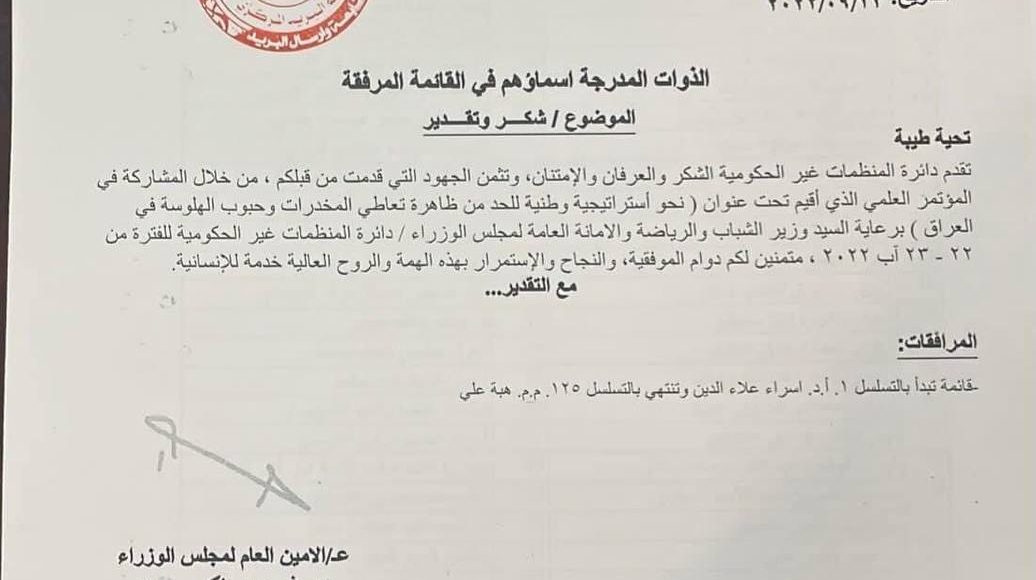 الاعتمادات وكتب الشكر شكر وتقدير لاعضاء مؤسسة العراقة للثقافة والتنمية من الامانة العامة لمجلس الوزراء بواسطة هيئة التحرير في سبتمبر 15, 2022 674 شارك شكر وتقدير لاعضاء مؤسسة العراقة للثقافة والتنمية من الامانة العامة لمجلس الوزراء. 674 شارك فيسبوكTwitterجوجل بلسReddItواتس ابباينتريستالبريد الإلكتروني
