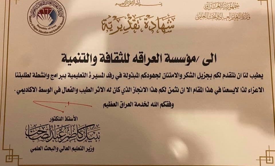الاعتمادات وكتب الشكر شكر وتقدير من معالي وزير التعليم العالي والبحث العلمي لمؤسسة العراقة للثقافة والتنمية بواسطة هيئة التحرير في فبراير 26, 2021 442 شارك شكر وتقدير من معالي وزير التعليم العالي والبحث العلمي الاستاذ الدكتور نبيل كاظم المحترم لمؤسسة العراقة للثقافة والتنمية . 442 شارك فيسبوكTwitterجوجل بلسReddItواتس ابباينتريستالبريد الإلكتروني