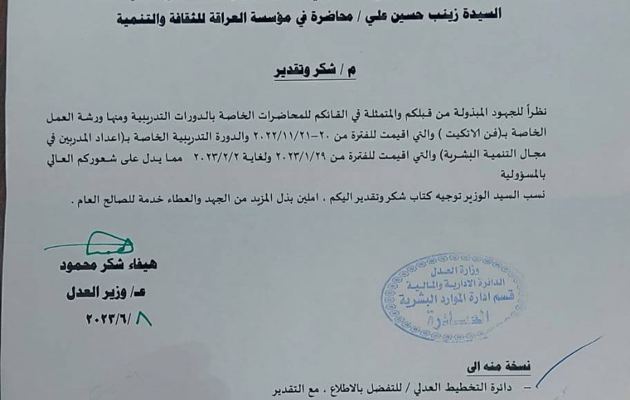 الاعتمادات وكتب الشكر شكر وتقدير من معالي وزير العدل للملاك التدريبي لمؤسسة العراقة للثقاقة والتنمية بواسطة هيئة التحرير في يونيو 16, 2023 506 شارك شكر وتقدير من معالي وزير العدل للملاك التدريبي لمؤسسة العراقة للثقاقة والتنمية. 506 شارك فيسبوكTwitterجوجل بلسReddItواتس ابباينتريستالبريد الإلكتروني