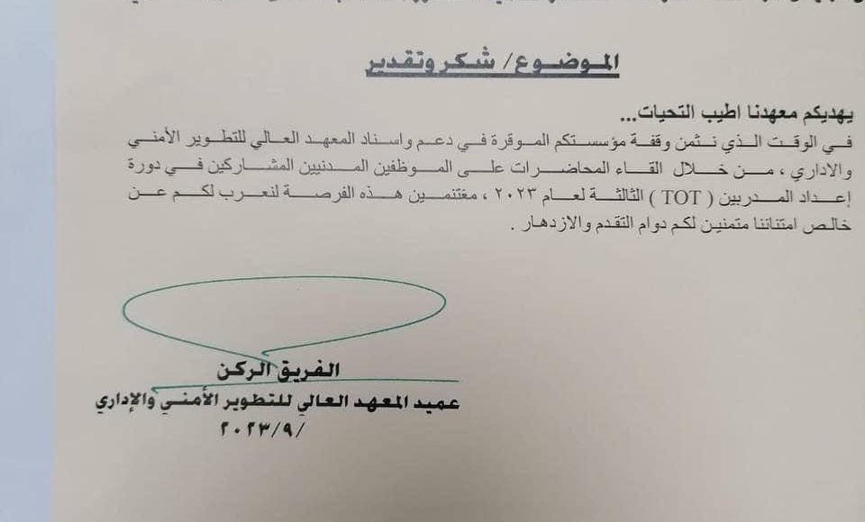 الاعتمادات وكتب الشكر شكر وتقدير من وزارة الداخلية لرئيس مؤسسة العراقة للثقافة والتنمية بواسطة هيئة التحرير في سبتمبر 22, 2023 452 شارك شكر وتقدير من وزارة الداخلية لرئيس مؤسسة العراقة للثقافة والتنمية الدكتور علاء عبدالخالق المندلاوي لجهودة العلمية في تدريب ملاكات الوزارة من موظفين ومراتب ومنتسبين. 452 شارك فيسبوكTwitterجوجل بلسReddItواتس ابباينتريستالبريد الإلكتروني