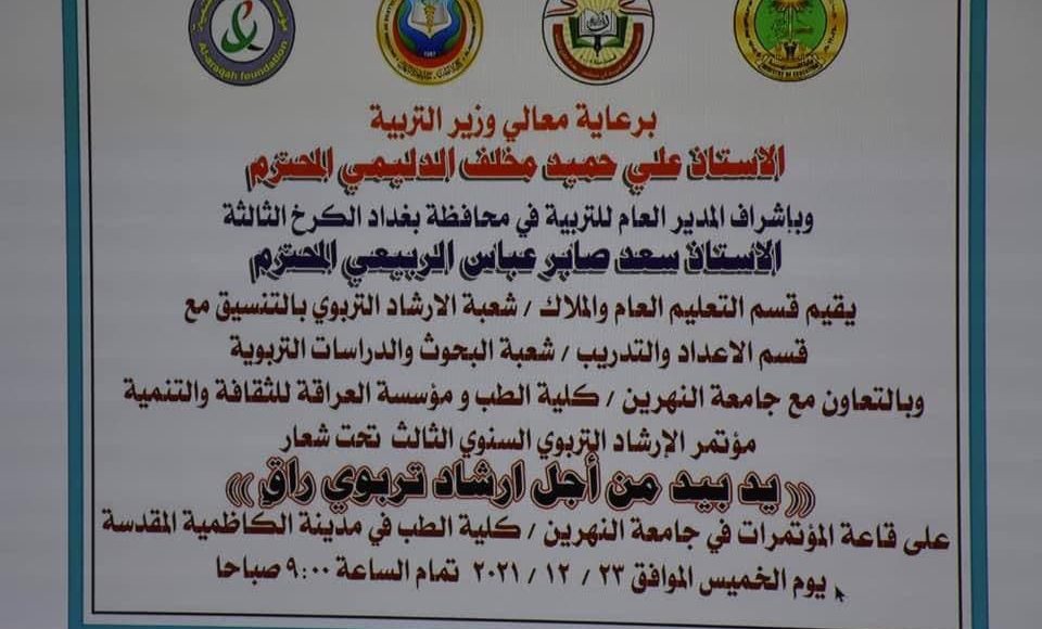 اقام قسم التعليم العام والملاك / شعبة الارشاد التربوي بالتنسيق مع قسم الاعداد والتدريب / شعبة البحوث والدراسات التربوية وبالتعاون مع جامعة النهرين / كلية الطب و مؤسسة العراقة للثقافة والتنمية مؤتمر الإرشاد التربوي السنوي الثالث تحت شعار((يد بيد من أجل ارشاد تربوي راقٍ)) الخميس الموافق 23/12/202