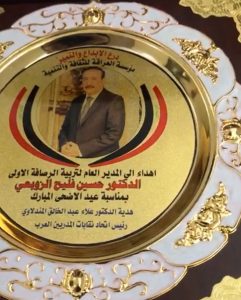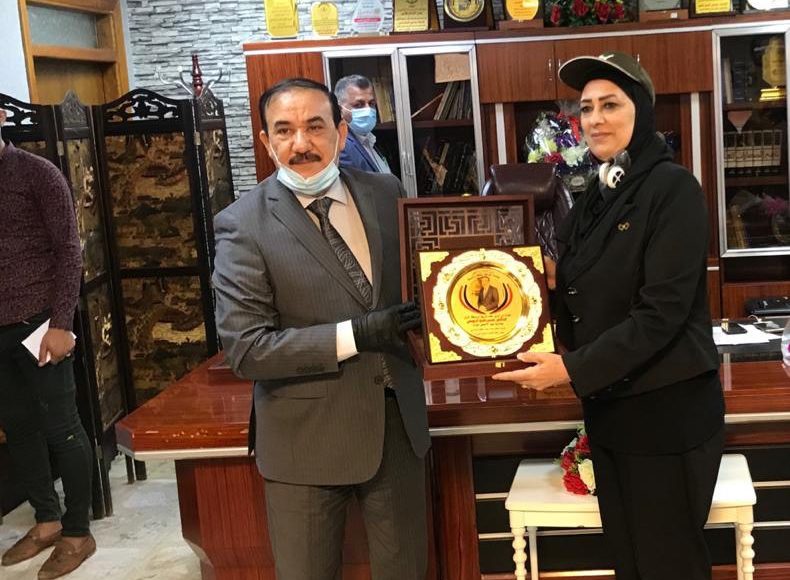 قدمت السيدة نهاد صبري عضو مكتب النقابة العامة للمدربين العراقيين وعضو اتحاد نقابات المدربين العرب درع الابداع والتميز للسيد مدير عام تربية بغداد الرصافه الاولى الاستاذ حسين الزوبعي المحترم لجهوده العلمية والإدارية وتسهيل الاجراءات بالتنسيق المشترك بين مدارس قاطع الاعظميه مع النقابة العامة للمدربين العراقيين في تعفير المراكز الامتحانيه ومساعدة العوائل المتعففه والمصابه بفايروس كورونا وزيارةمعهد الحنان لشديدي العوق ومعهد الامل للمشردات.