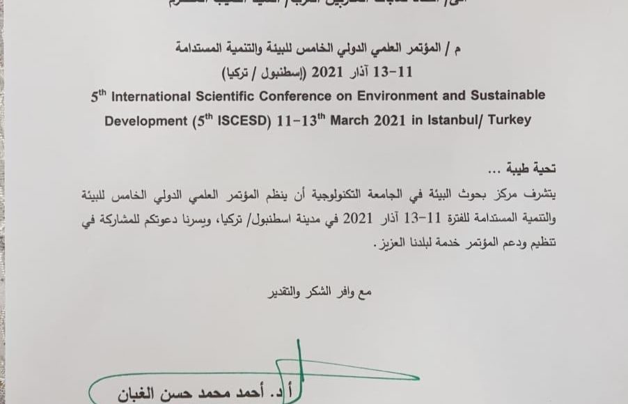 مؤسسة العراقة للثقافة والتنمية من الجهات الراعية للمؤتمر العلمي الدولي الدولي الخامس للبيئة والتنمية المستدامة / الجامعة التنكولوجية