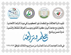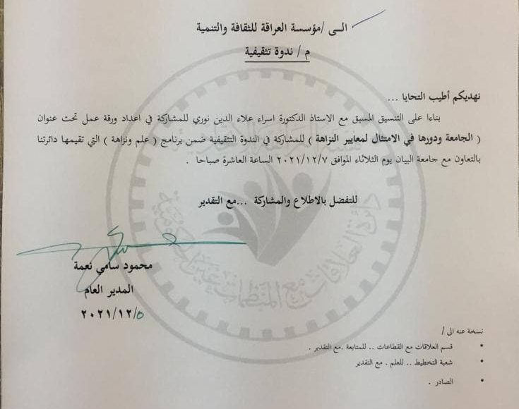 الدورات والندوات العلمية ندوة تثقيفية ضمن برنامج علم ونزاهة بواسطة هيئة التحرير في ديسمبر 6, 2021 199 شارك ندوة تثقيفية ضمن برنامج علم ونزاهة التي تقيمها هيئة النزاهة ومؤسسة العراقة للثقافة والتنمية وجامعة البيان الثلاثاء الموافق 7/12/2021 199 شارك فيسبوكTwitterجوجل بلسReddItواتس ابباينتريستالبريد الإلكتروني