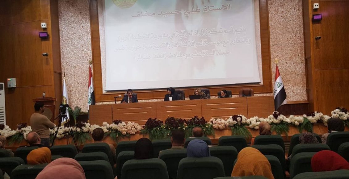 برعاية معالي وزير التربية الأستاذ علي حميد الدليمي وبحضور الوكيل الفني للوزارة الاستاذ حسين صبري اللامي والوكيل الاداري للوزارة الدكتور فلاح القيسي نظم قسم تمكين المرأة العراقية في مديرية التخطيط التربوي ومؤسسة العراقة للثقافة والتنمية ندوة حوارية ضمن حملة “الستة عشر” يوما لمناهضة العنف ضد المرأة على قاعة أحمد بن فضلان في مبنى الوزارة الخميس الموافق ١٨/١١/٢٠٢١