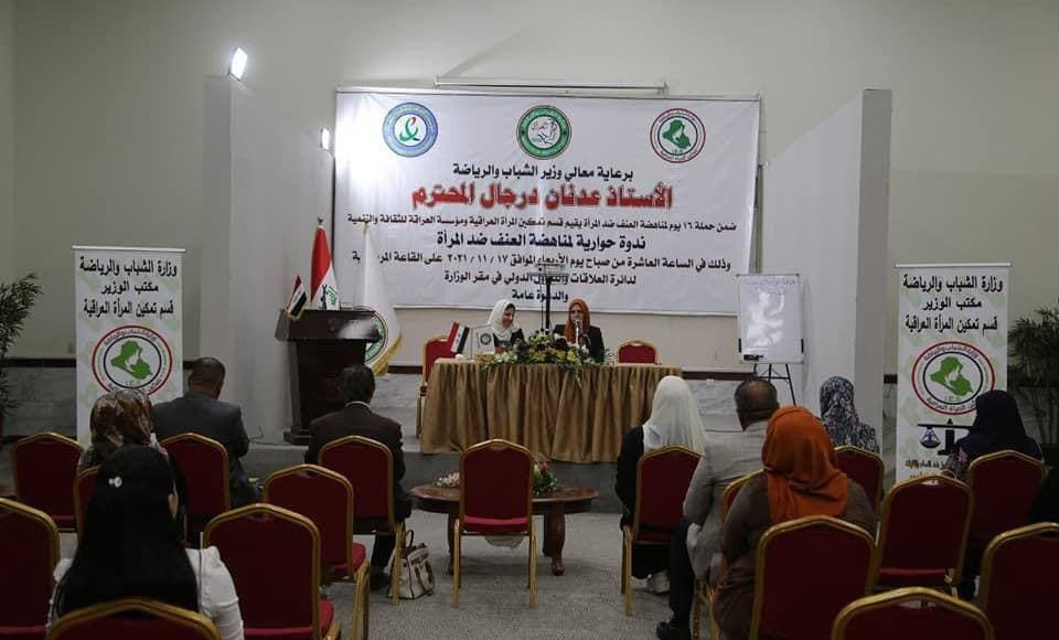 ضمن حملة 16 يوم لمناهضة العنف ضد المرأة قامت وزارة الشباب والرياضة /قسم تمكين المرأة العراقية ومؤسسة العراقة للثقافة والتنمية ندوة حوارية لمناهضة العنف ضد المرأة الأربعاء الموافق 17/11/2021