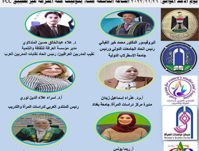 برعاية دولة رئيس مجلس الوزراء المهندس محمد شياع السوداني المحترم اقام مركز دراسات المرأة ومؤسسة العراقة للثقافة والتنمية والمنتدى العربي لدراسات المرأة والتدريب والجمعية اللبنانية للتجديد التربوي والثقافي الخيرية واتحاد الجامعات الدولي ندوة علمية دولية بعنوان (المرأة … شريك رئيس في تحقيق الاستدامة البيئية) يوم الاحد الموافق ٢٦ / ١١ / ٢٠٢٣ عبر منصة FCC