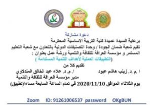 بمشاركة فاعلة وحضور متميز (٨٠ )مشارك من الملاكات التعليمية في الجامعات العراقية ووزارة التربية ومنظمات المجتمع المدني في ورشة العمل ( التطبيقات العلمية لاهداف التنمية المستدامة )الثلاثاء الموافق ١٠/١١/٢٠٢٠