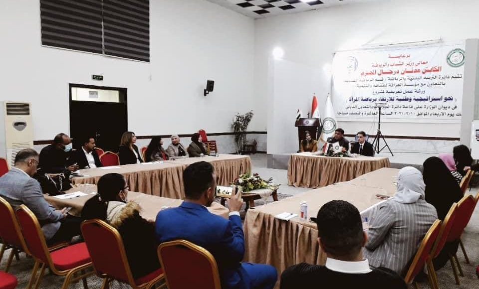 ورشة عمل تعريفية لمشروع ( نحو استراتيجية وطنية للارتقاء برياضة المراة ) في ديوان الوزارة على قاعة دائرة العلاقات والتعاون الدولي اليوم الاربعاء الموافق ٢٠٢١/٢/١٠