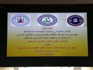 وقائع المؤتمر العلمي الدولي التاسع والاربعون (نحو استراتيجية وطنية لتنمية العمل التطوعي في العراق ) التي اقامتها مؤسسة العراقة للثقافة والتنمية والنقابة العامة للمدربيين العراقيين والبورد الالماني للتدريب والاستشارات اليوم السبت الموافق 22/2/2020