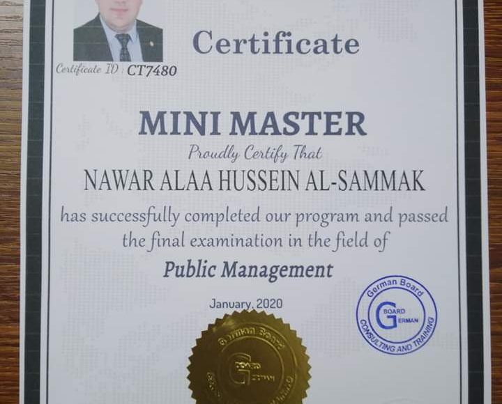 يسرنا تقديم التهنئة لحصول السيد نوار علاء حسين على الماجستير المهني في الادارة العامة من البورد الالماني للتدريب والاستشارات بأشراف مدير البورد في الشرق الاوسط ومدير مؤسسة العراقة للثقافة والتنمية الدكتور علاء عبد الخالق المندلاوي د.علاء عبد الخالق المندلاوي مدير البورد في الشرق الاوسط مدير مؤسسة العراقة للثقافة والتنمية