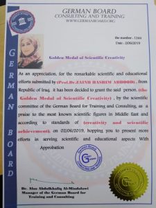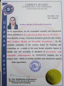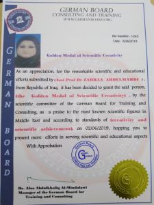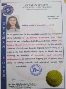 وسام الابداع العلمي الذهبي ( البورد الالماني للتدريب والاستشارات ) تكريم عدد من النخب والكفاءات العلمية في العراق بوسام الابداع العلمي الذهبي من بورد الألماني للتدريب والاستشارات لجهودهم العلمية والتربوية والثقافية على وفق معايير الابداع